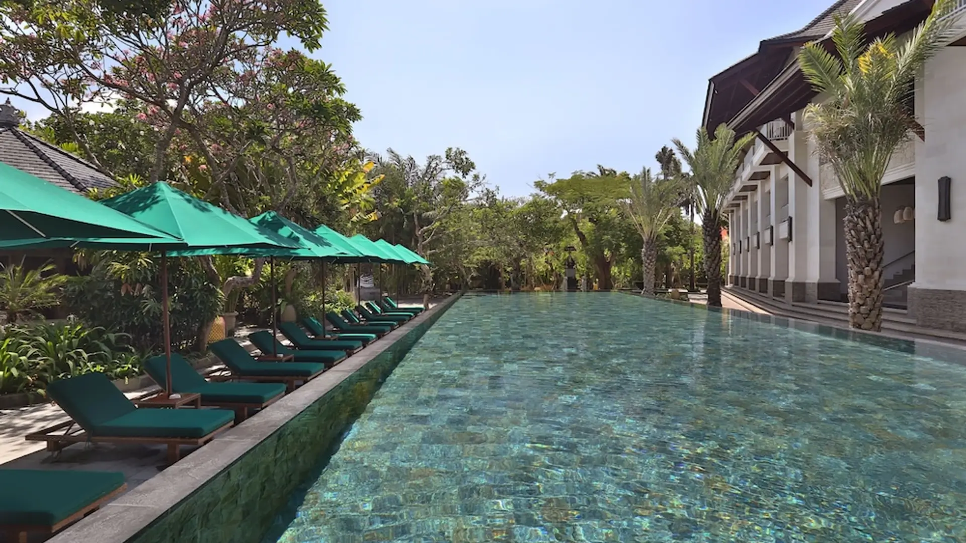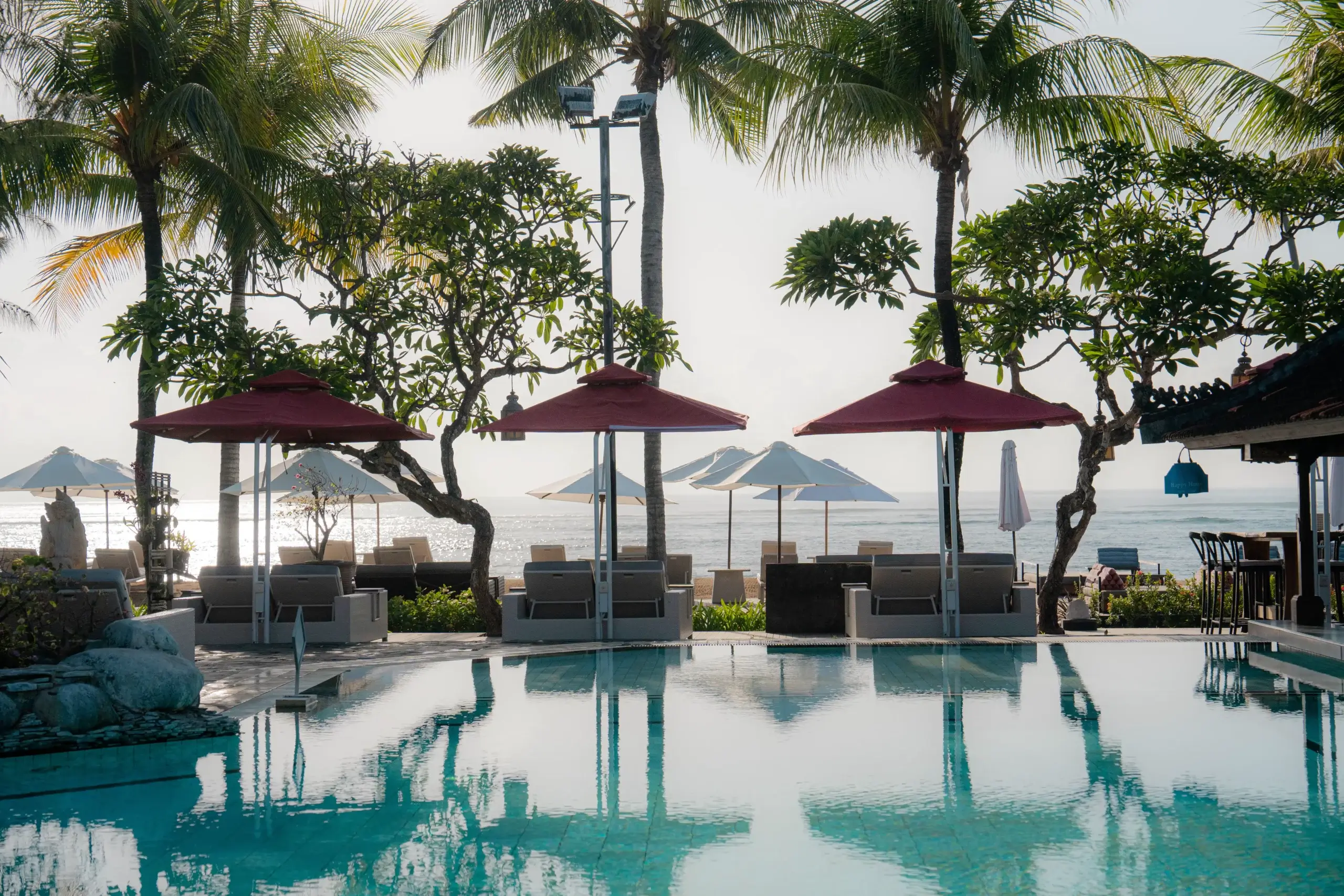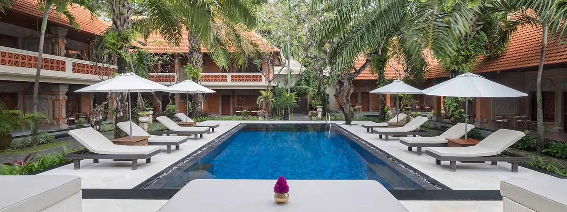 A classic Bali beachfront stay on Sanur’s serene sunrise coast, Griya Santrian blends traditional Balinese warmth with lush tropical gardens – an easy, restful base between appointments and gentle beach walks.